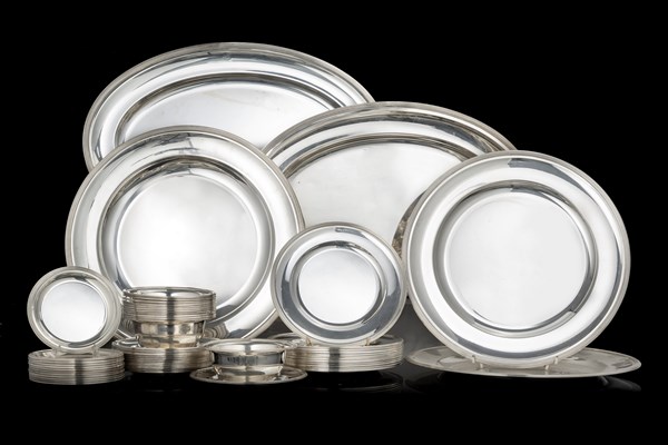 A silver flatware comprising two fish dishes, two round plates, one round tray, twelve saucers, twelve bread plates, twelve washers with saucers. Title 800. Silversmith Nicoletti (g 12000)