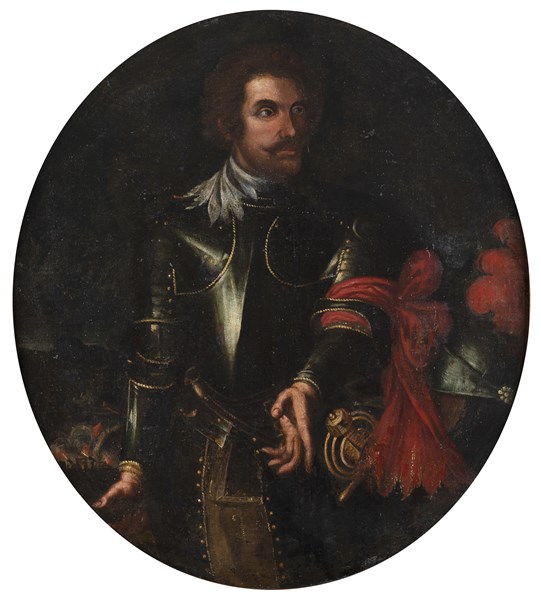 Scuola del secolo XVII Ritratto di condottiero in armatura Olio su tela ovalec
