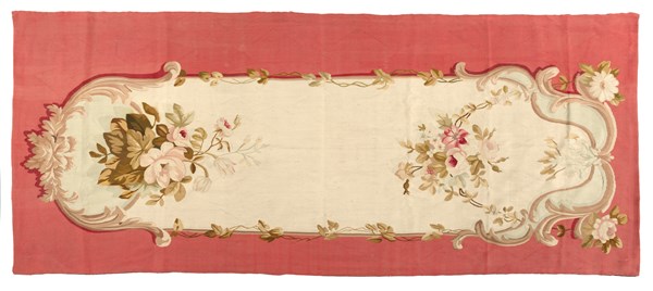 Arazzo Aubusson "Entre-Fenetre" Francia, secolo XIX. Decoro con mazzi di fiori e volute su campo bianco entro una base color rosa antico (cm 291x117) (lievi difetti)