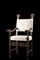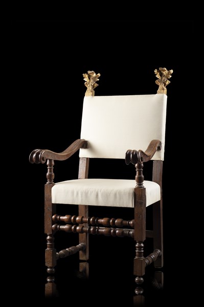 Seggiolone in legno intagliato con braccioli terminanti a ricciolo, gambe tornite riunite da traverse, schienale squadrato decorato da finali a foglia dorata. Secolo XVII (cm 70x126x62) (difetti)