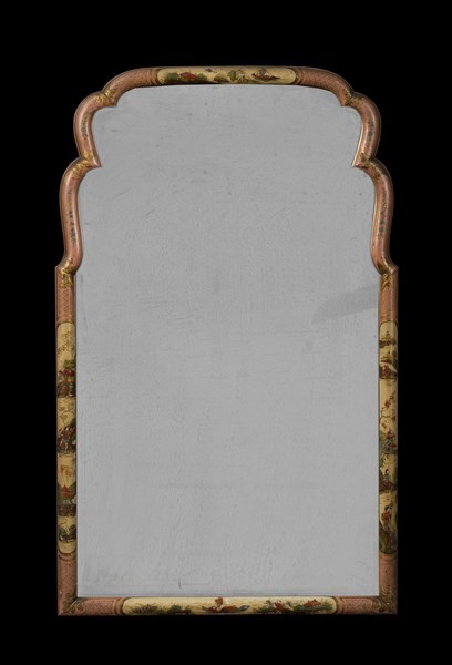 Specchiera in legno laccato, dipinto e dorato di forma sagomata decorata a chinoiserie. Veneto, inizio secolo XVIII (cm 45x77) (difetti, specchio di epoca posteriore)