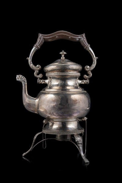 Samovar con fornelletto in argento parzialmente martellato, profili a palmette, beccuccio antropomorfo, presa del coperchio a trottola, ansa a doppia voluta e legno sagomato, tre piedi ferini con motivo a foglia all'attacco. Titolo 800, Milano. Marcato Gabrielli, Via del Lauro (h. cm 30) (g lordi 1600 ca.) (difetti)