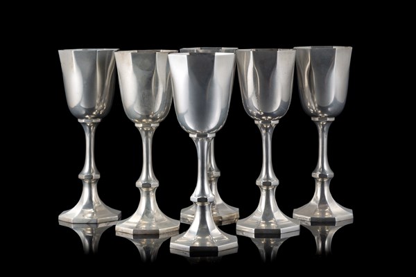 Gruppo di sei calici in argento con base ottagonale. Titolo 925. Milano, argentiere Pradella Ilario per Cusi (h. cm 19) (g 1000)