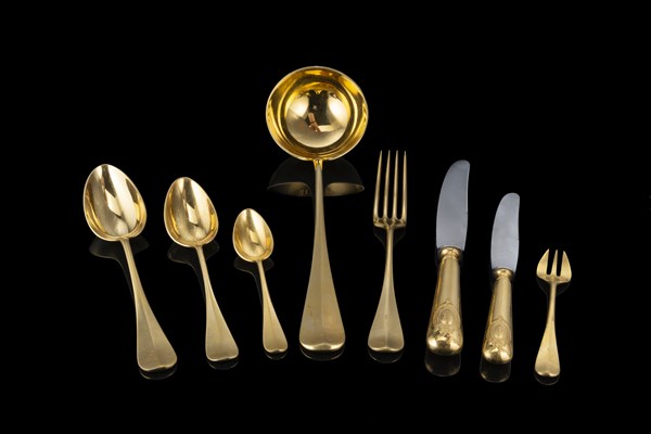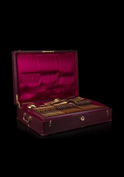 Berndorf Krupp. Servizio di posate in metallo dorato con prese a corpo liscio decorate al retro da cifre MP entro cornice a fiocco composto da dodici forchette, cucchiai e coltelli grandi, dodici forchette e coltelli da frutta, dodici forchette e cucchiai da dolce, dodici cucchiaini e un mestolo. In custodia (difetti)