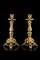 Coppia di candelieri in bronzo dorato decorato a volute fogliate, perlinature, fiori e valve di conchiglia. Piedi ferini poggianti su basi sagomate. Secolo XIX (h. cm 32,5) (lievi difetti)