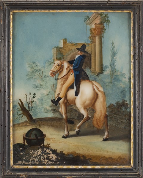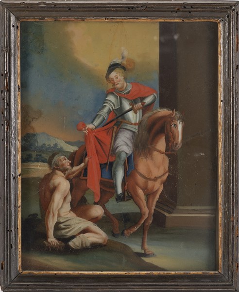School of the 18th century "Nobleman on horseback" and "St. Martin's charity" pair of verre-peints (cm 26x20) In lacquered and gilded wooden frames (defects and restoration)