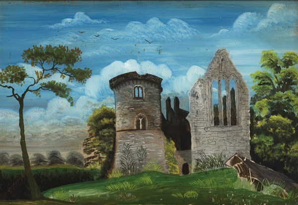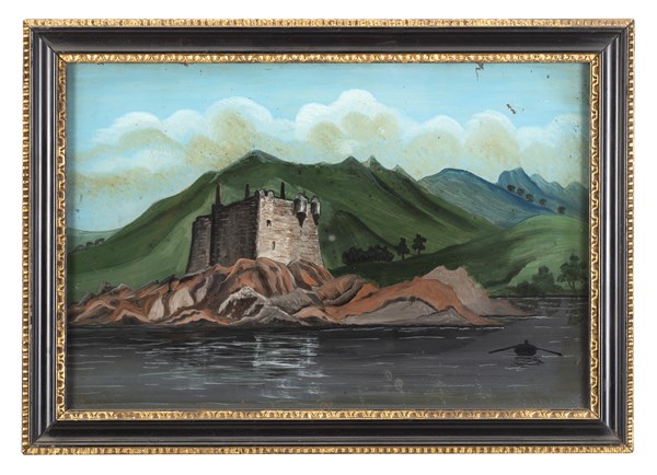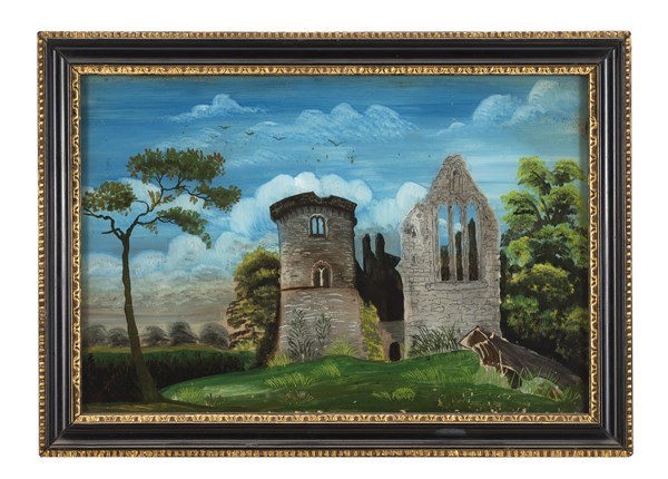 Lot 525 | Scuola del secolo XIX "Fortificazioni in paesaggi" coppia di verre-peint (cm 20