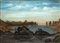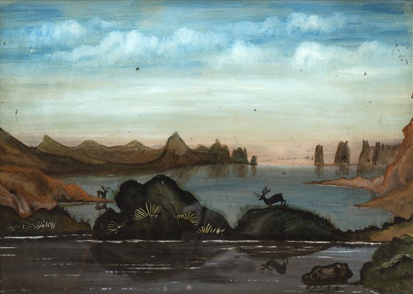 Scuola del secolo XIX "Paesaggio lacustre con cervi" verre-peint (cm 22x32) In