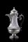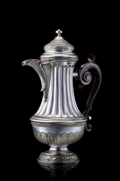 Teiera in argento di forma piriforme a corpo costolato. Base circolare, coperchio cesellato a foglie con presa a trottola. Ansa a doppia voluta in legno. Titolo 800, Milano. Argentiere Mangili Eliseo (h. cm 32,5) (g lordi 1100)