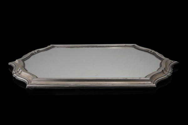 Centrotavola con fondo a specchio in argento, bordo sagomato. Titolo 800 (cm 60