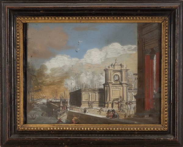 Scuola del secolo XVIII "Scorcio di città portuale" verre-peint (cm 19x26) In cornice in legno laccato e dorato (difetti)