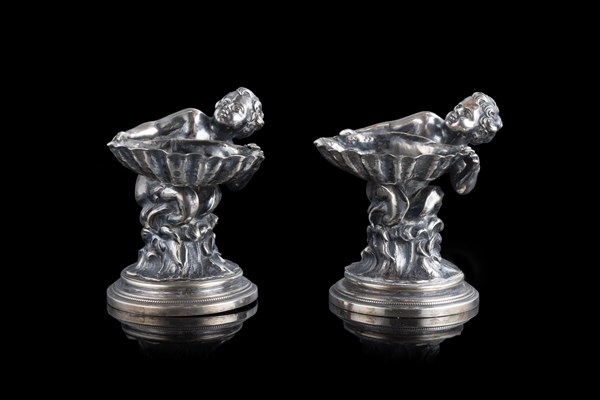Coppia di saliere in argento a forma di tritone a tutto tondo che sorregge valv