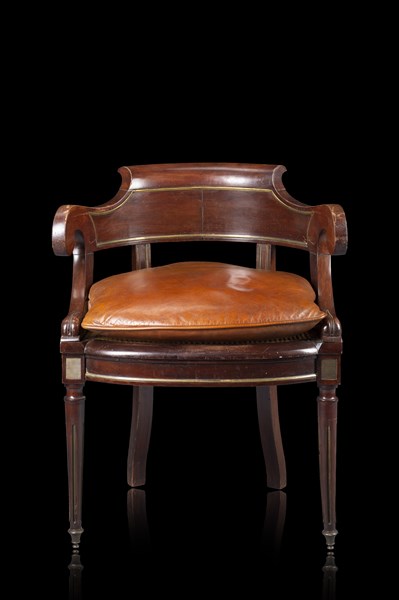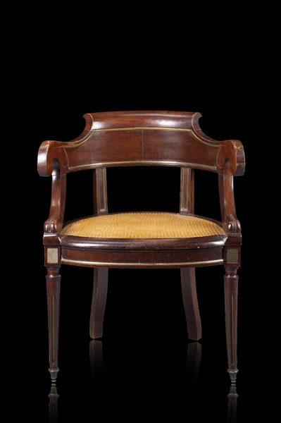 Poltrona a pozzetto in mogano filettata in metallo dorato con seduta incannucciata, braccioli terminanti a ricciolo. Gambe anteriori rastremate e posteriori a sciabola. Fine secolo XIX. Con cuscino in pelle (difetti)
