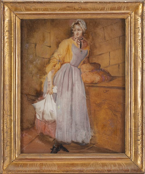 Scuola fiamminga, secolo XVIII "Contadina" e "Interno di osteria" coppia di verre-peint (cm 25,5x20) In cornici in legno dorato (difetti)