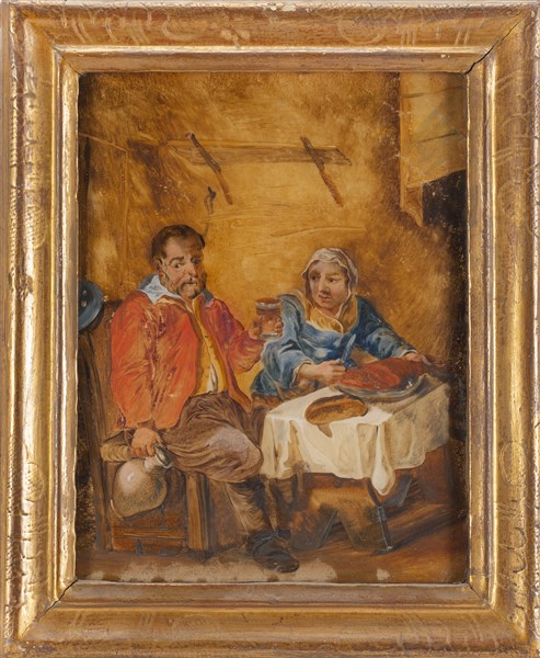 Flemish school, 18th century "Peasant" and "Interior of a tavern" pair of verre-peints (cm 25,5x20) In gilded wooden frames (defects)