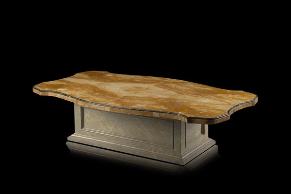 A yellow Siena marble top with Alpi green marble border (cm 160x4x94) on a carved wooden base painted in faux marble (cm 100x36x52) (defects)