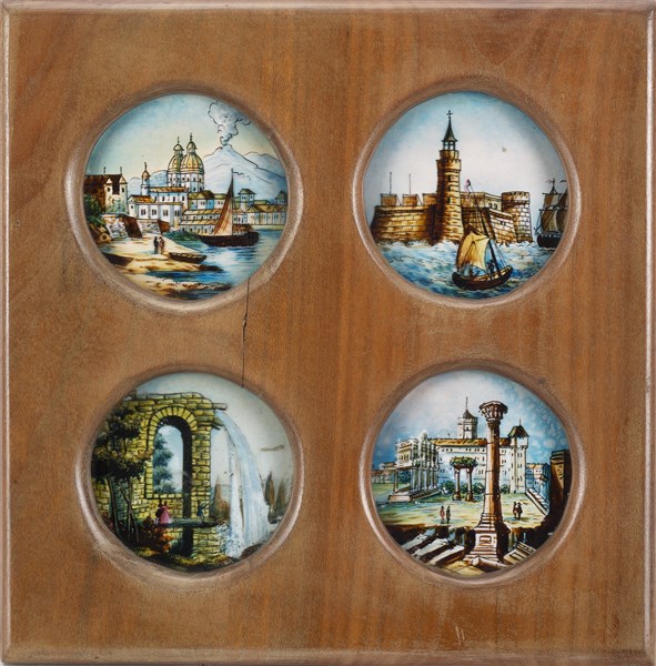 School of the end of the 19th century. Group of four circular verre-peints depicting views (d. cm 6) In wooden frame (cm 18,5x18,5) (defects)