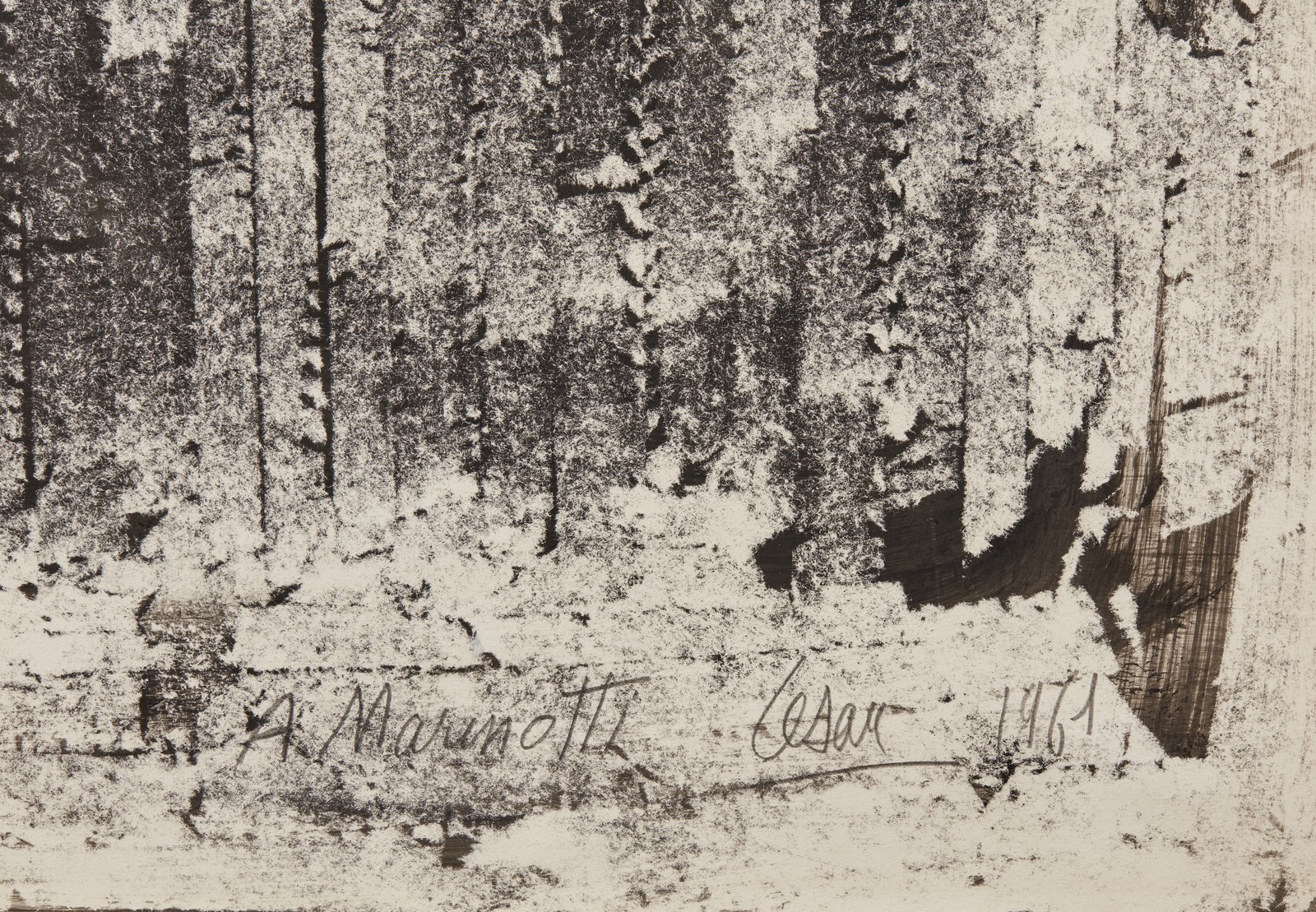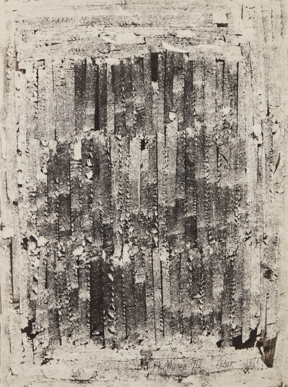 CESAR (1921 - 1998) Arrachage. 1961. China su carta. Cm 50,00 x 67,00. Firma, anno e dedica in basso a destra. L'opera verrà inserita nel Catalogue raissonè des Additifs du Tome I de Cesar, Edition de la Diffèrence. Opera registrata presso gli Archives Denyse Durand Ruel, Rueil-Malmaison con il numero n.7674. Provenienza: Collezione Paolo Marinotti, Milano; Collezione privata, Milano, Casa d'aste Il Ponte; Collezione privata, Firenze. Lievi difetti.