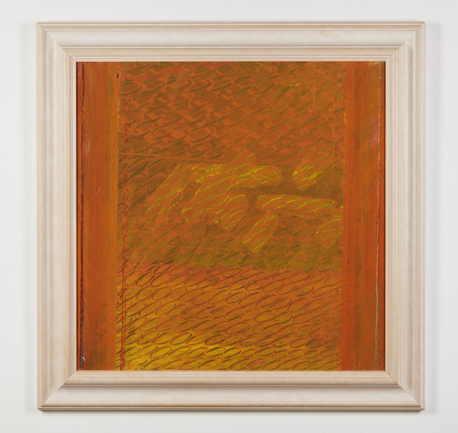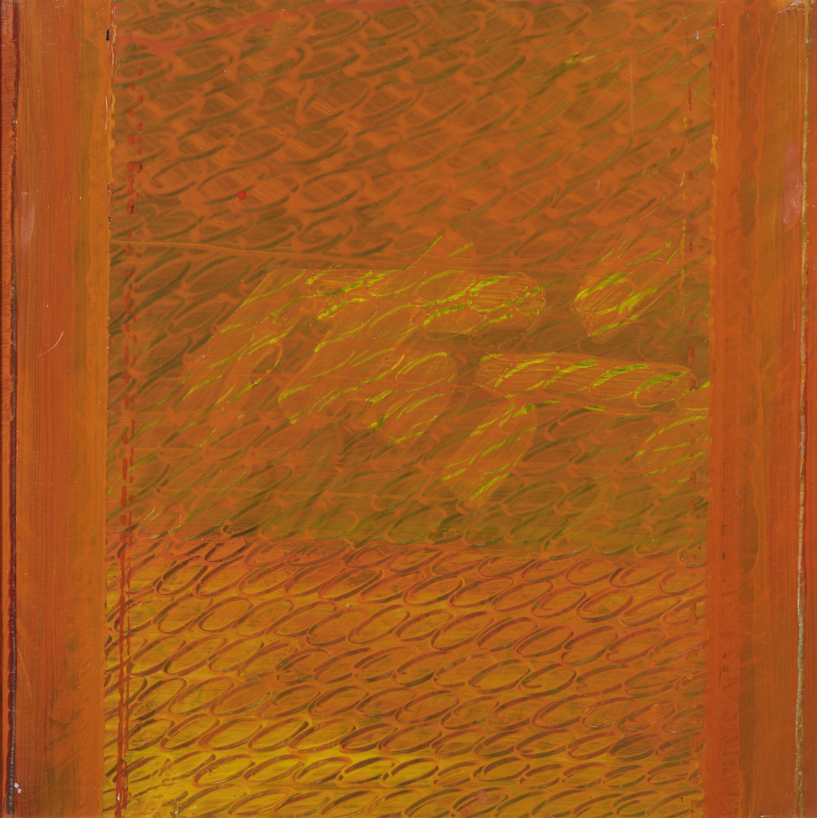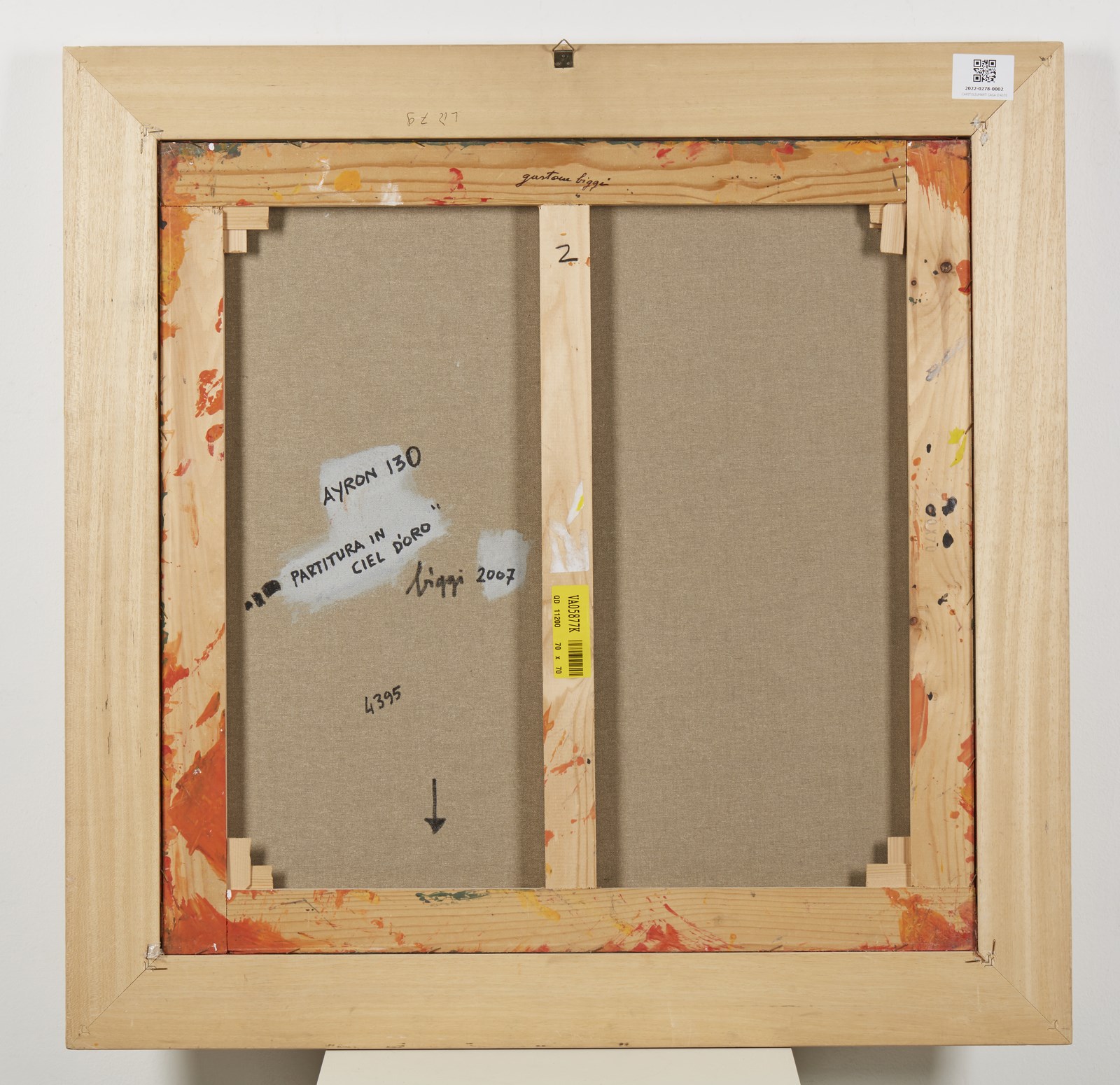BIGGI GASTONE (1925 - 2014) Ayron 130 "Partitura in ciel d'oro". 2007. Idropittura su tela. Cm 70,00 x 70,00. Firma, titolo e anno al retro. Autentica dell'artista su fotografia riportante il timbro Art Time e il relativo numero d'inventario. Certificato di provenienza Telemarket, Roncadelle (Bs). Cornice presente
