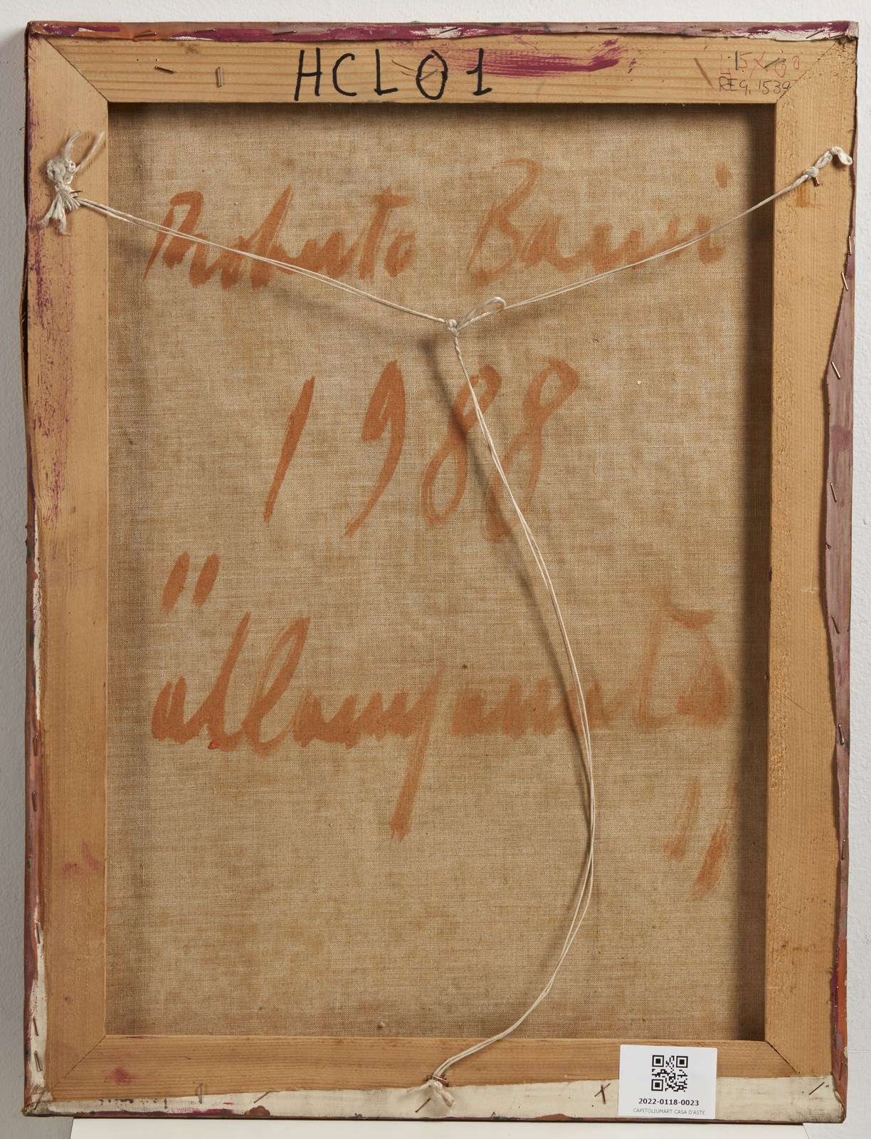 BARNI ROBERTO (n. 1939) Allampanato. 1988. Tecnica mista su tela. Cm 45,00 x 60,00. Al retro titolo, firma e anno. Lievi difetti.