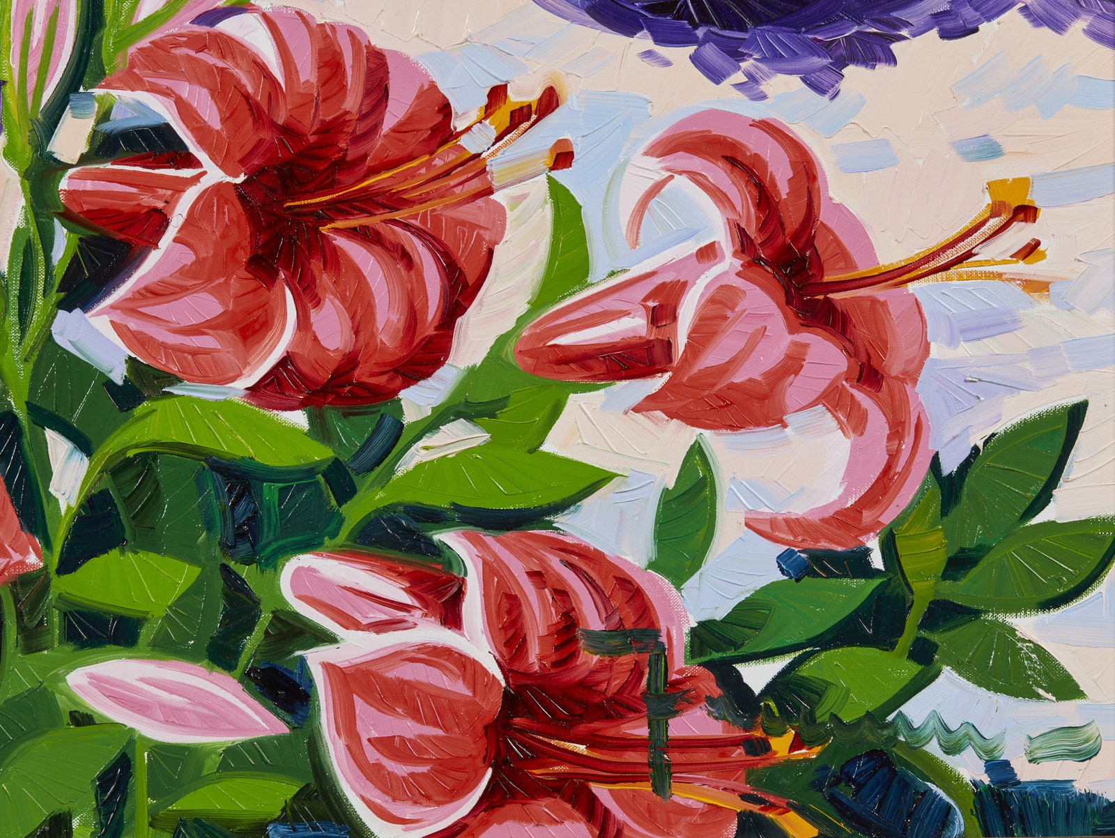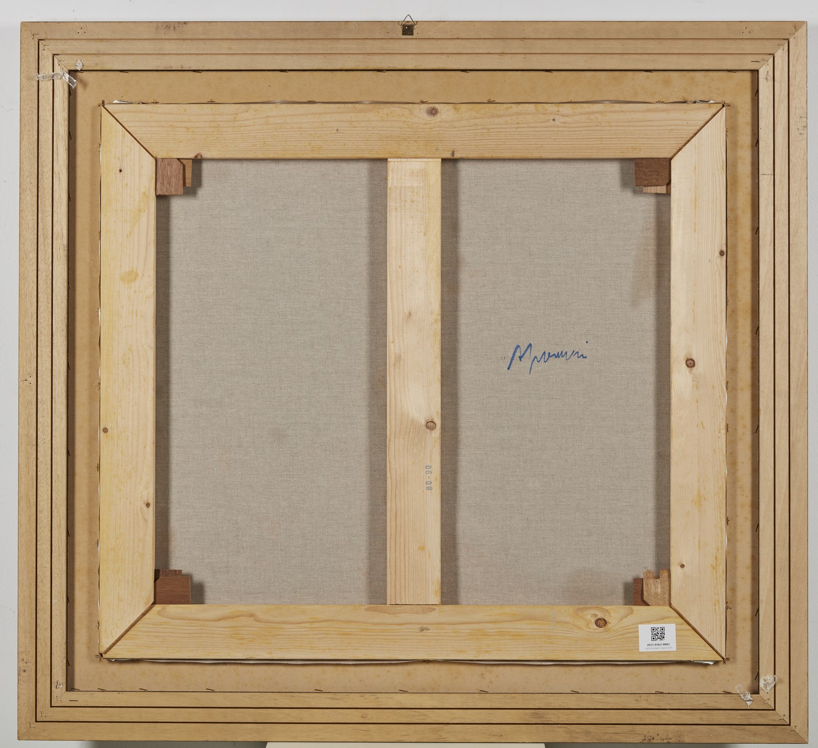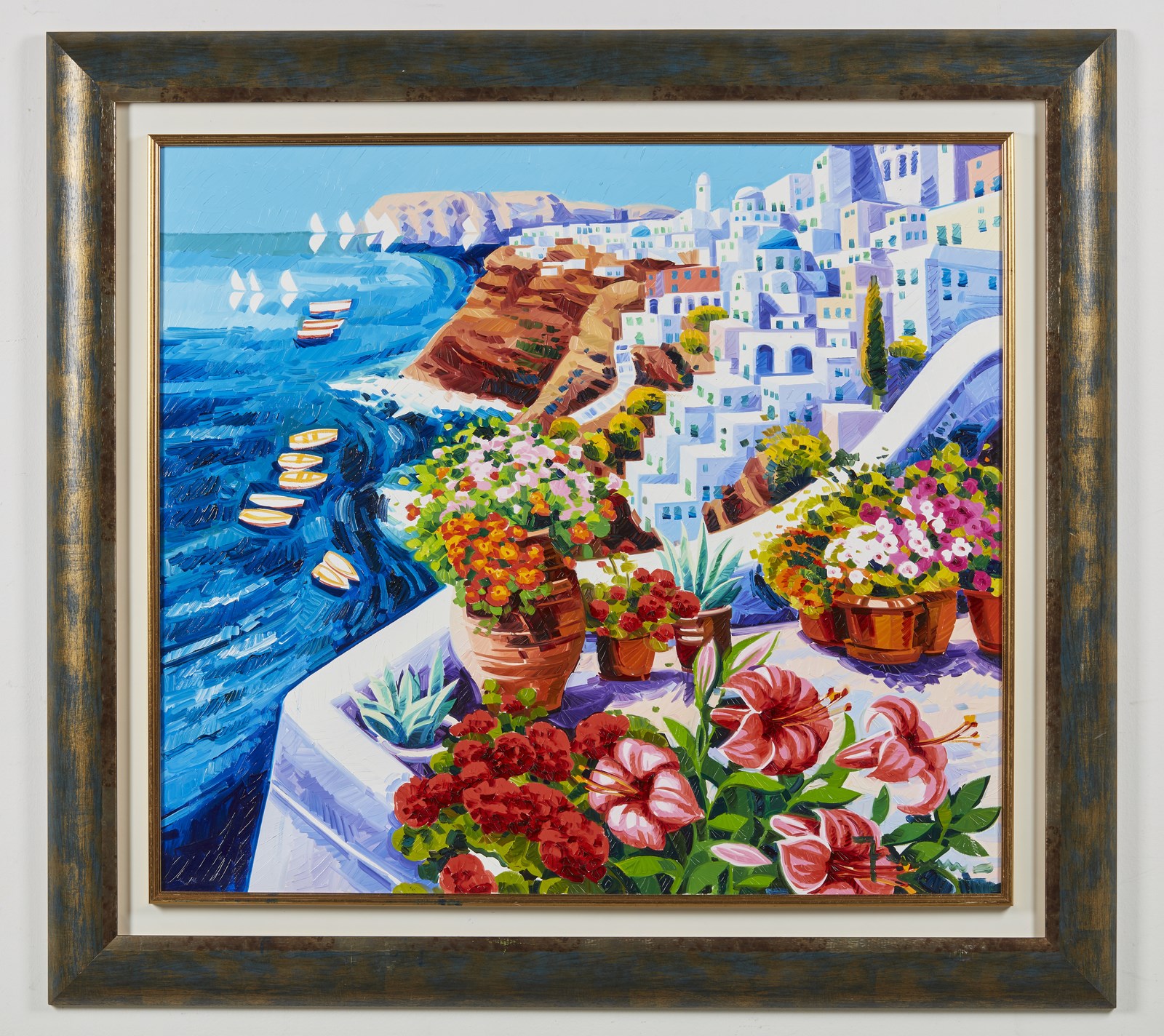 FACCINCANI ATHOS (n. 1951) Santorini e vasi di fiori sulla terrazza. 2010. Olio su tela . Cm 91,00 x 80,00. Firma in basso a destra e al retro. Autentica dell'artista su fotografia. Lievi difetti. . Cornice presente