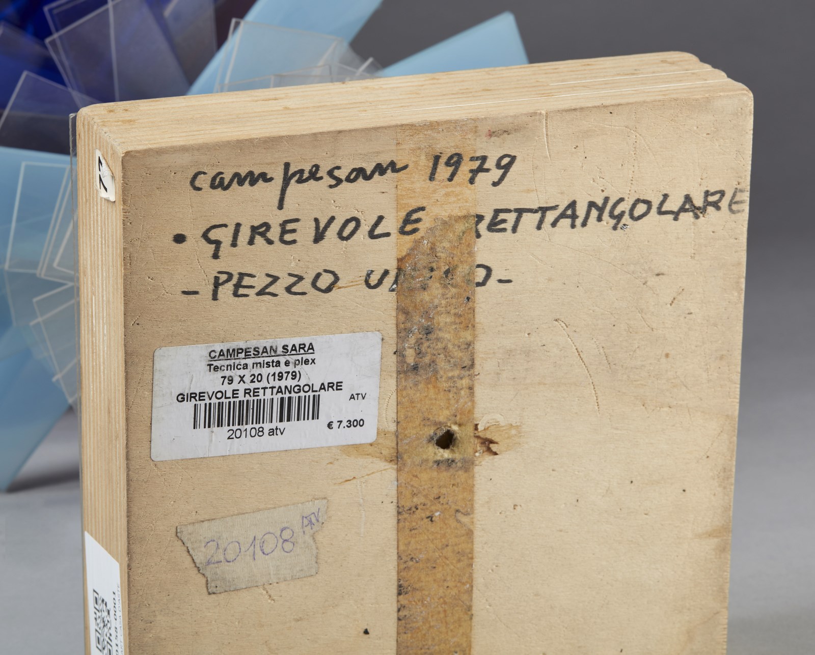 CAMPESAN SARA (n. 1924) Girevole rettangolare. 1979. Plexiglass. Cm 20,00 x 79,00. Titolo, firma e anno sotto la base. Autentica dell'artista su fotografia. Certificato di garanzia ArteTivù, Marcon. Lievi difetti.