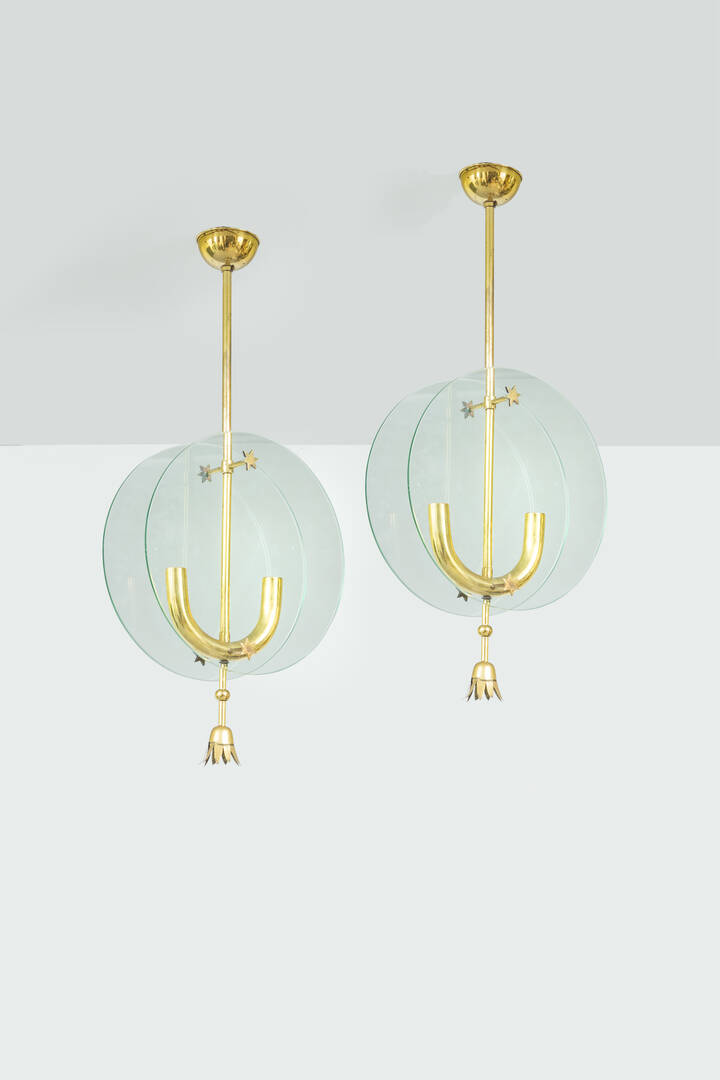 Coppia di lampadari con struttura in ottone lucido, dischi in vetro colorato.
