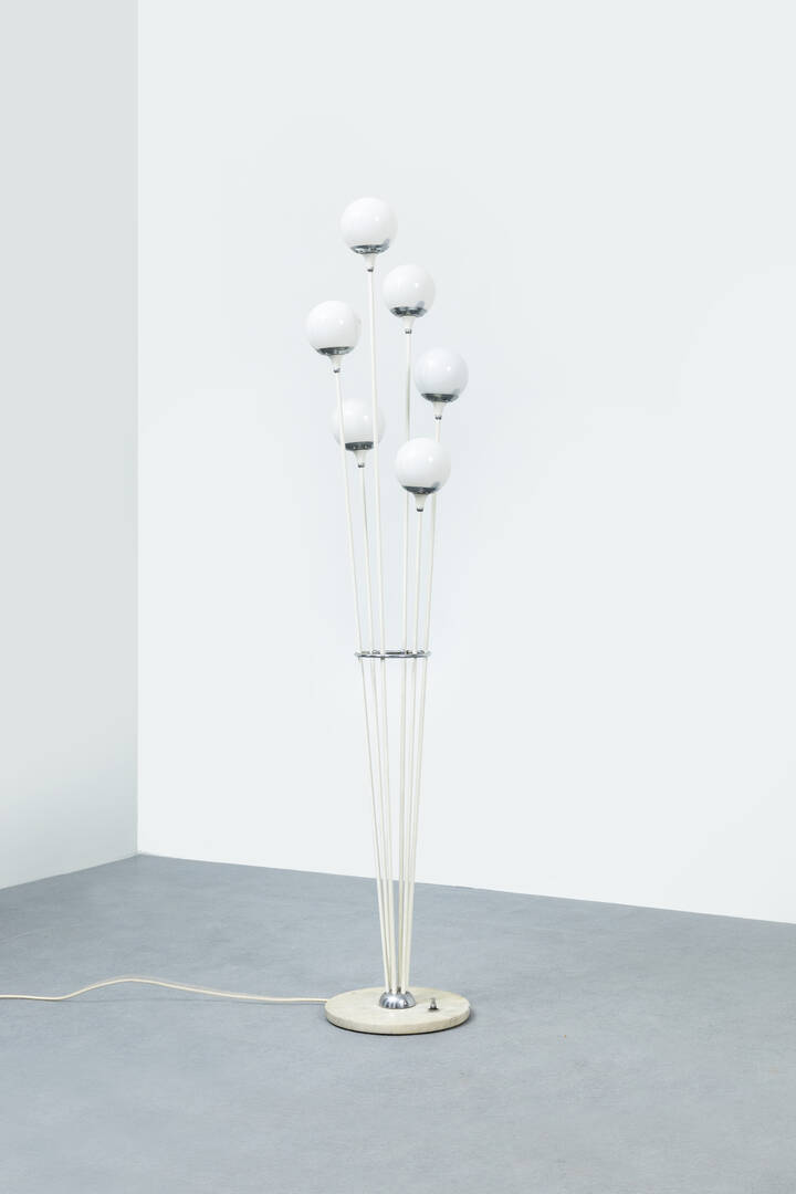 Lampada da terra in metallo verniciato, diffusori in vetro opalino, base in marmo.