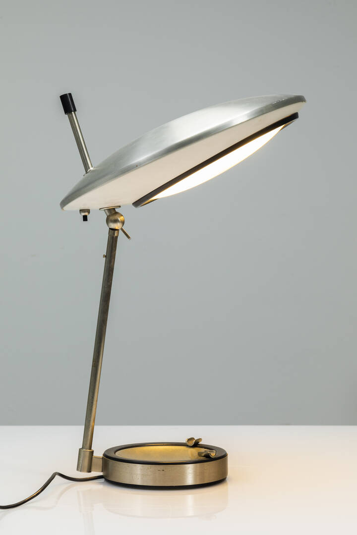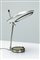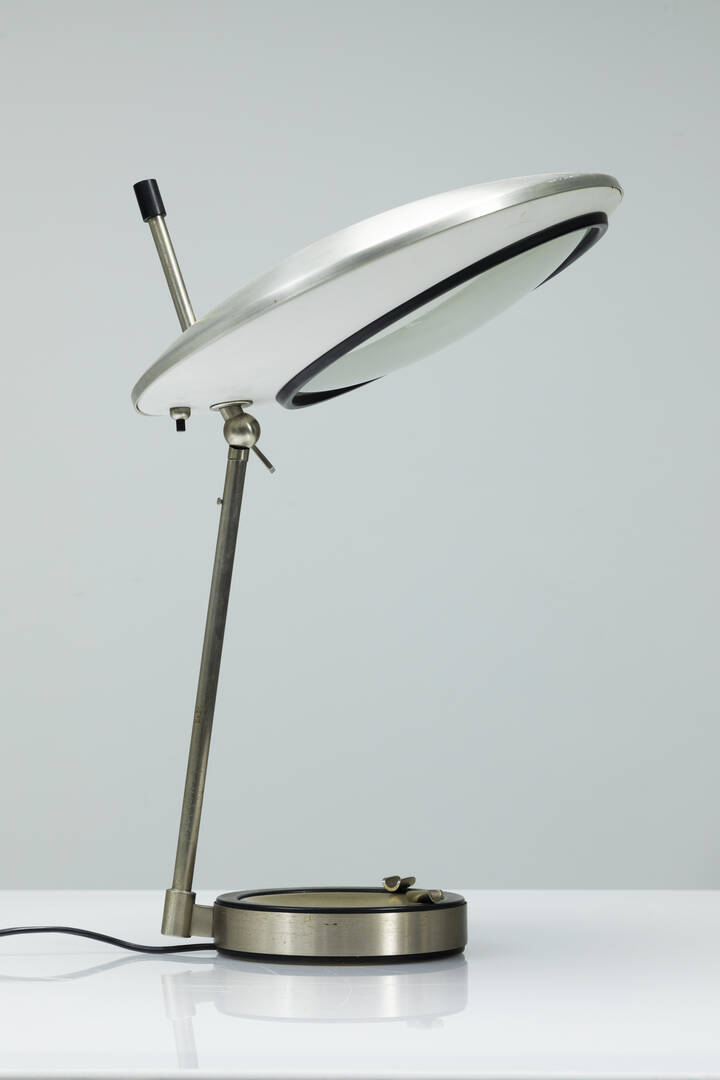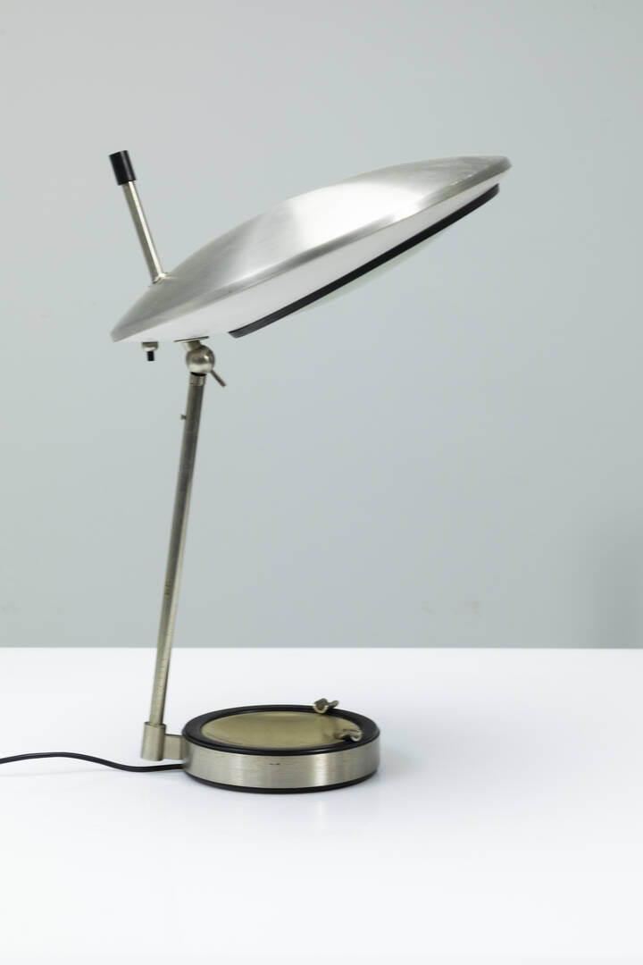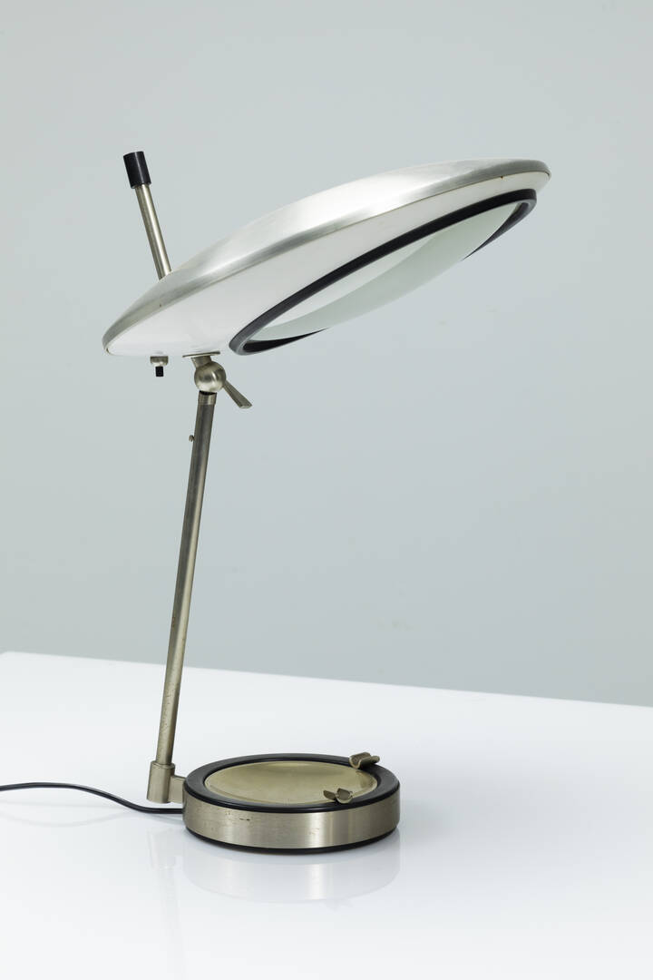 Lampada da tavolo in ottone nichelato, metallo laccato e vetro satinato.
