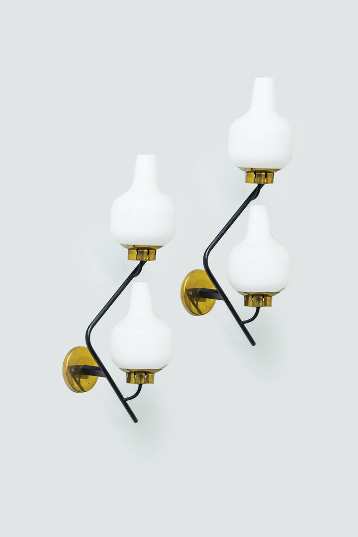 Coppia di appliques con struttura in metallo verniciato e ottone, diffusori in vetro satinato.