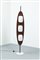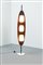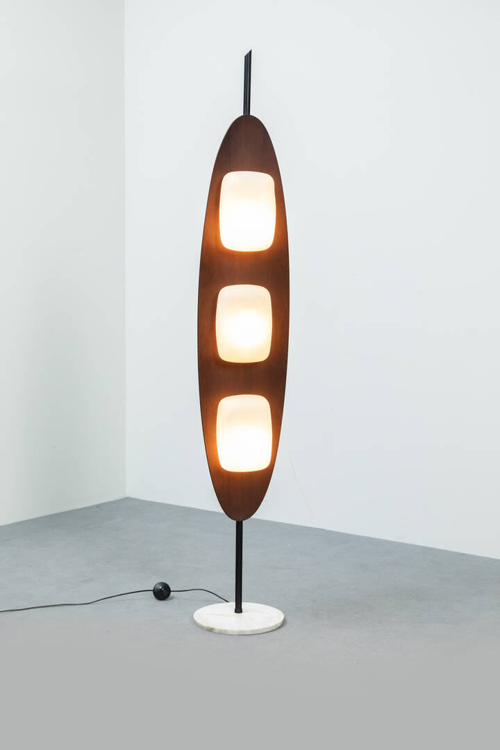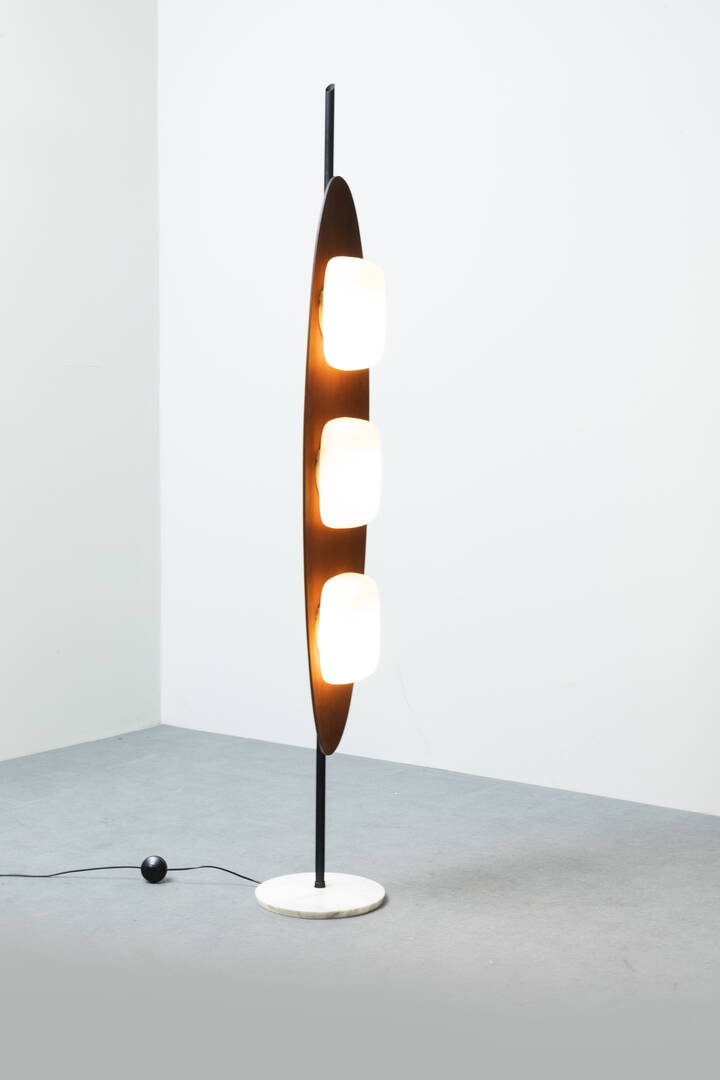 Lampada da terra con struttura in legno, metallo laccato e marmo, diffusori in vetro stampato.