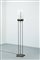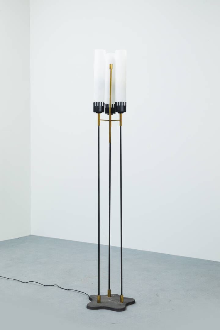 Lampada da terra in ottone e metallo verniciato, diffusori in vetro satinato.