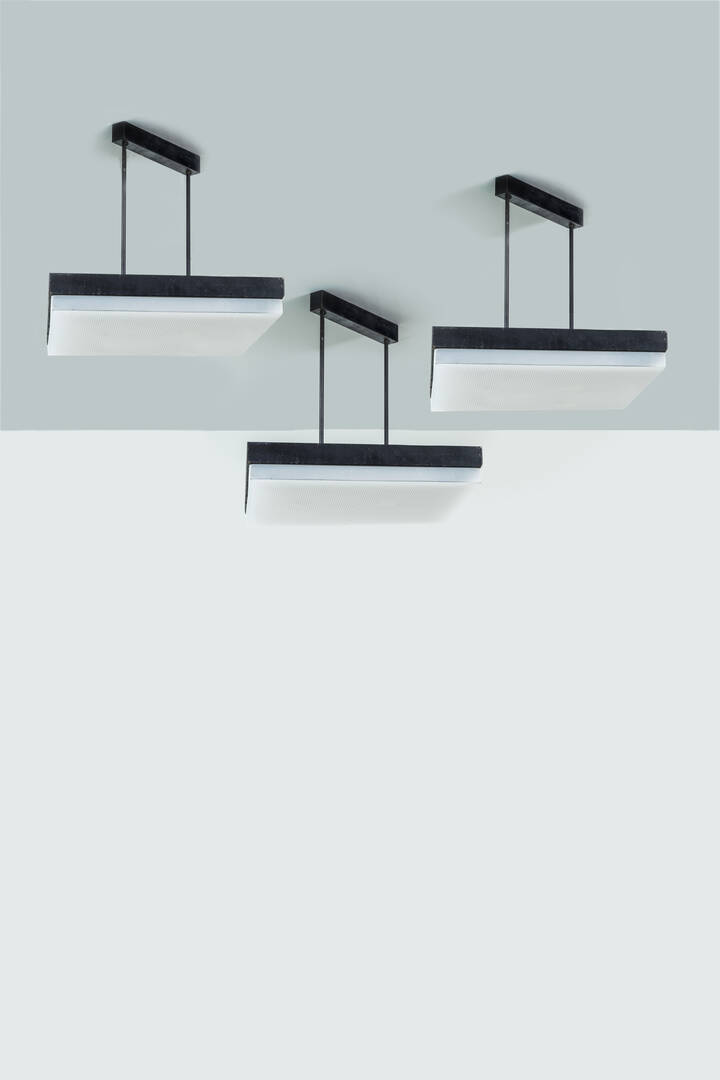 Tre lampade a plafone in metallo verniciato e plexiglass.