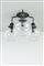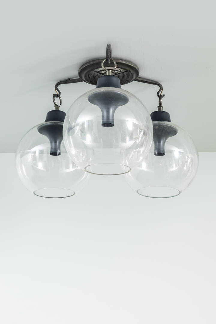 Lampadario con diffusori in vetro trasparente, montatura in metallo brunito.