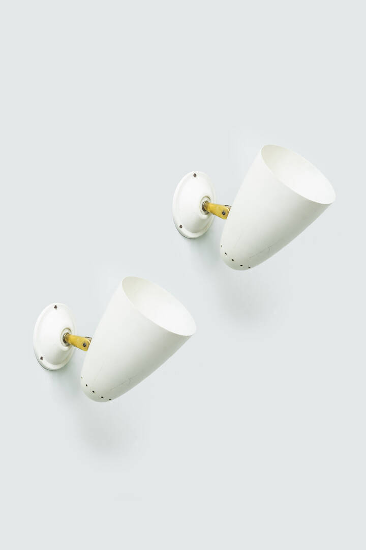 Coppia di lampade a muro in alluminio verniciato e ottone.
