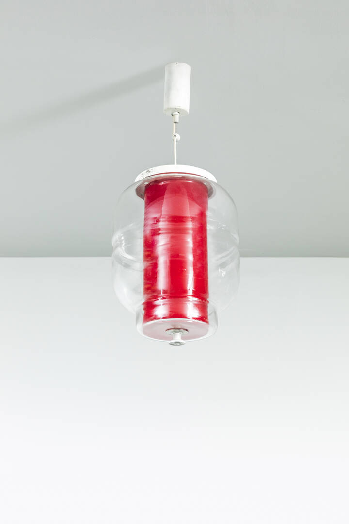 Lampadario in cristallo con all'interno cilindro in vetro incamiciato.