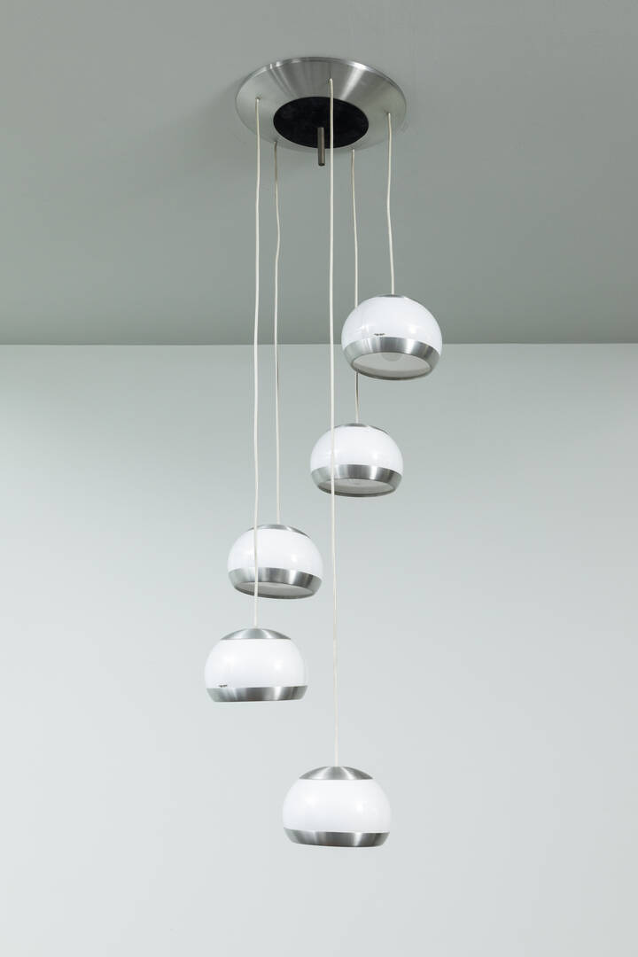 Lampadario in metallo cromato e perspex.