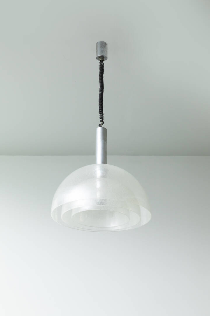 Lampada a sospensione con diffusore costituito da tre calotte in vetro soffiato, tige in metallo.