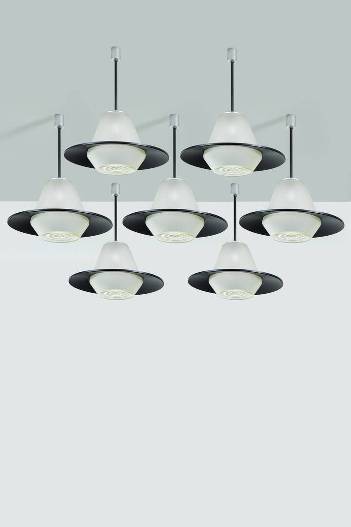 Sette lampadari in metallo verniciato, diffusori in vetro satinato.