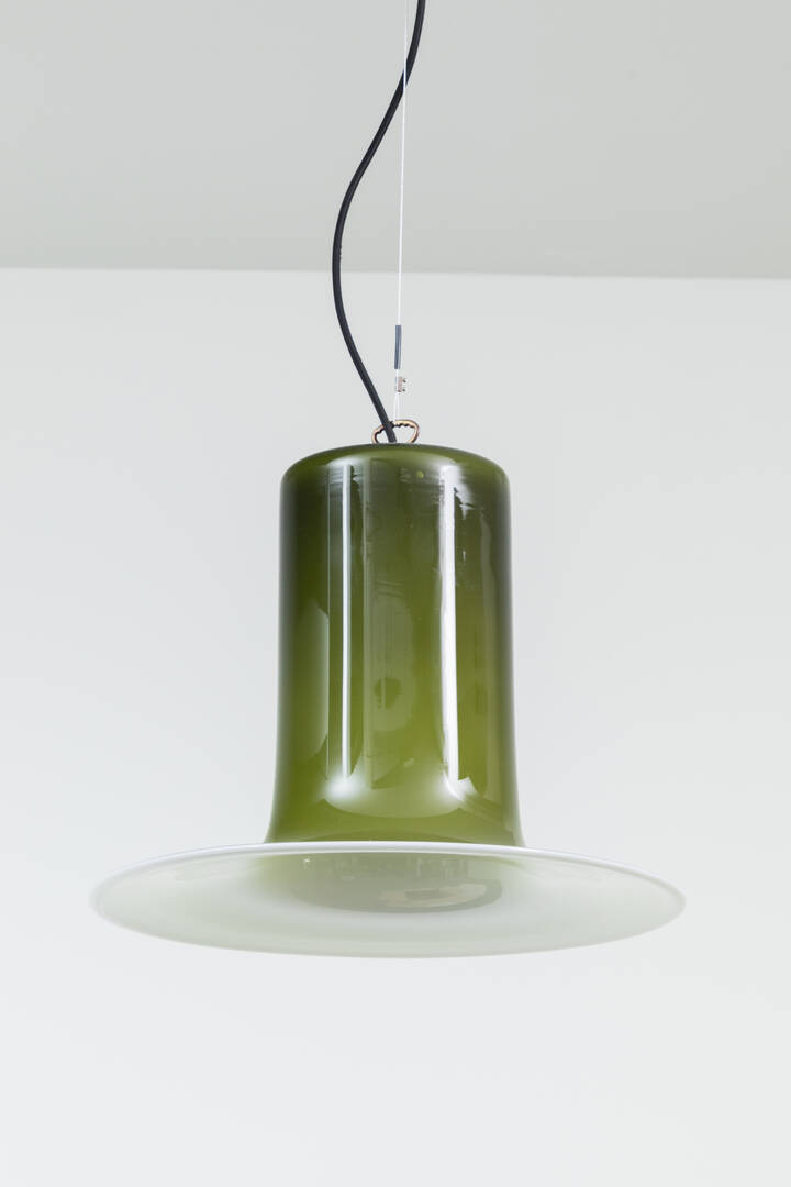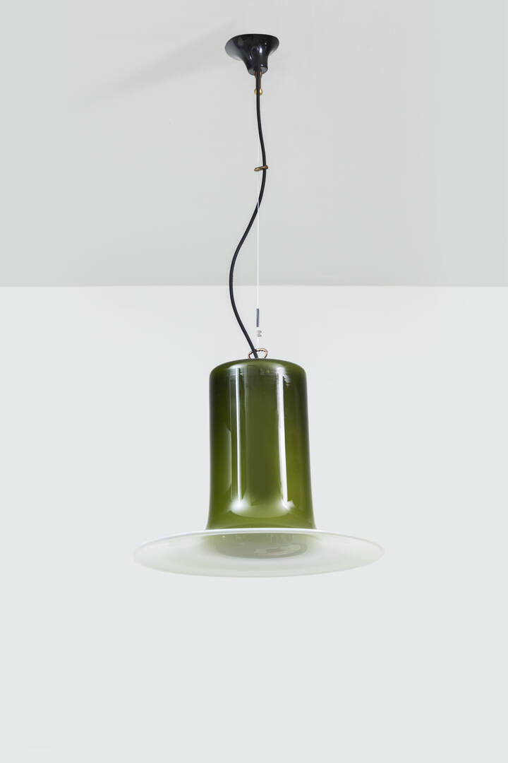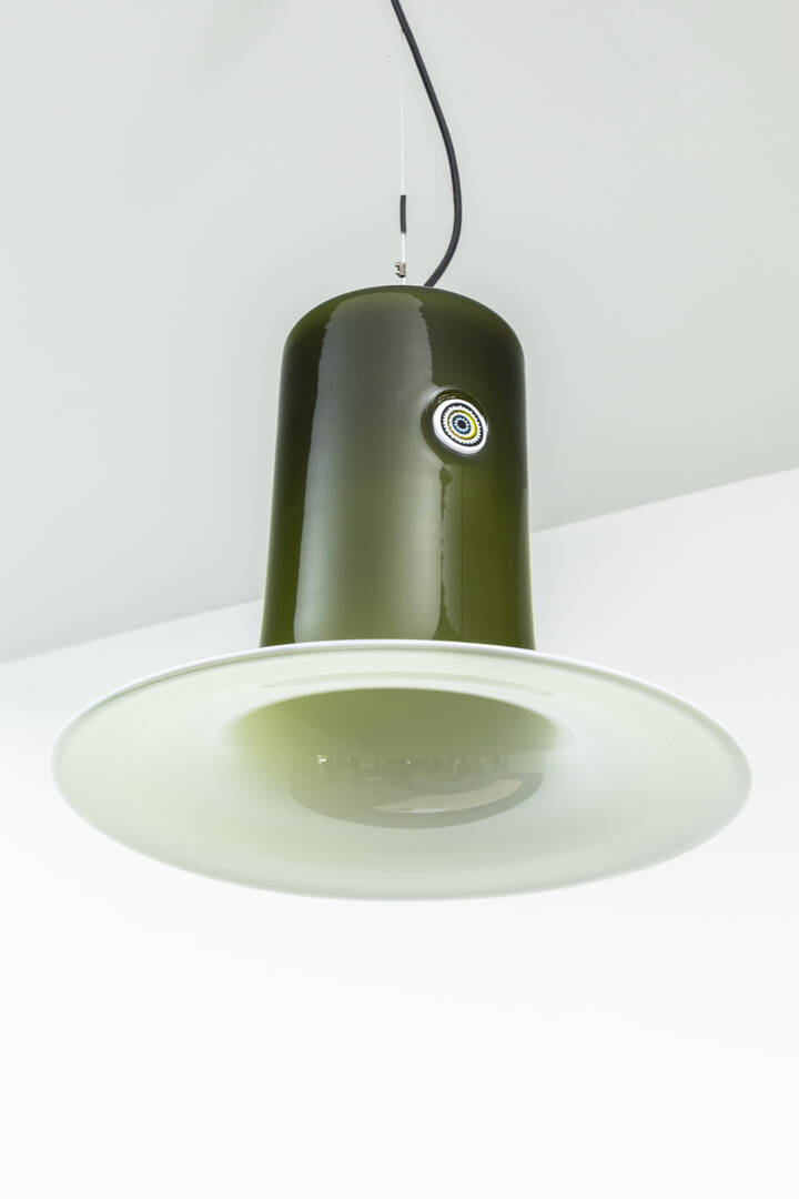 Lampada a sospensione con struttura in metallo e diffusore in vetro di Murano incamiciato. Applicazione di murrina a decoro.