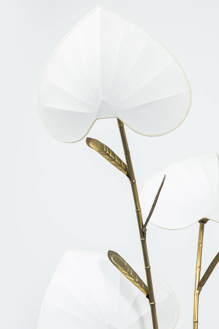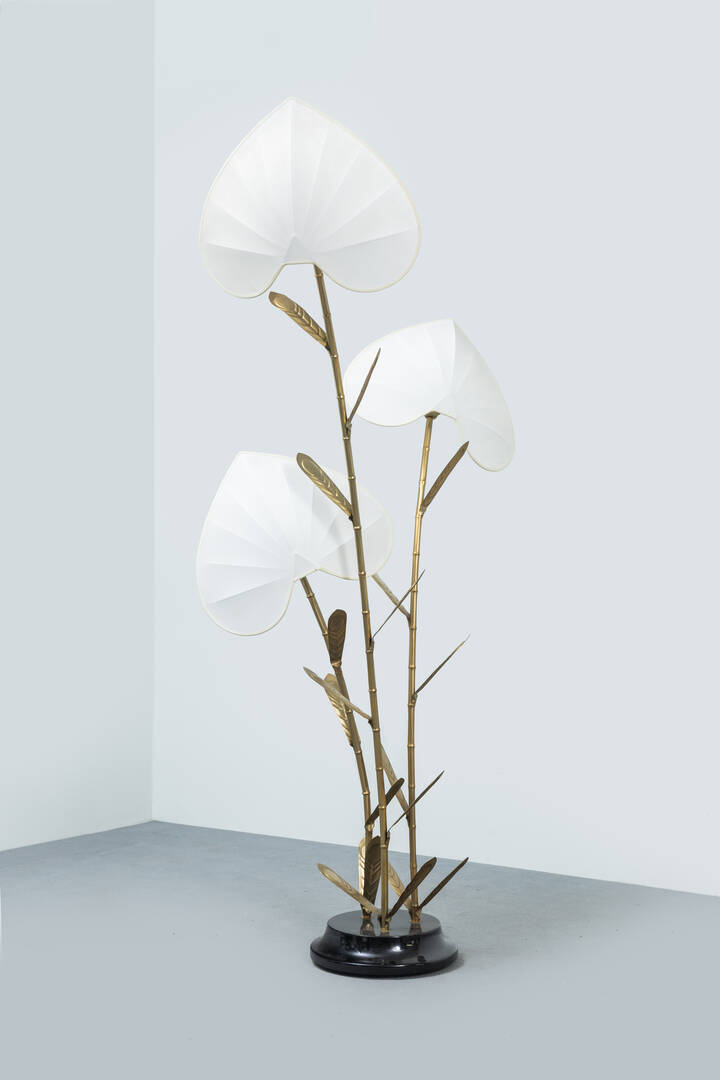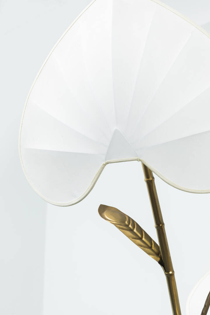 Lampada da terra con struttura in ottone, paralumi in tessuto.