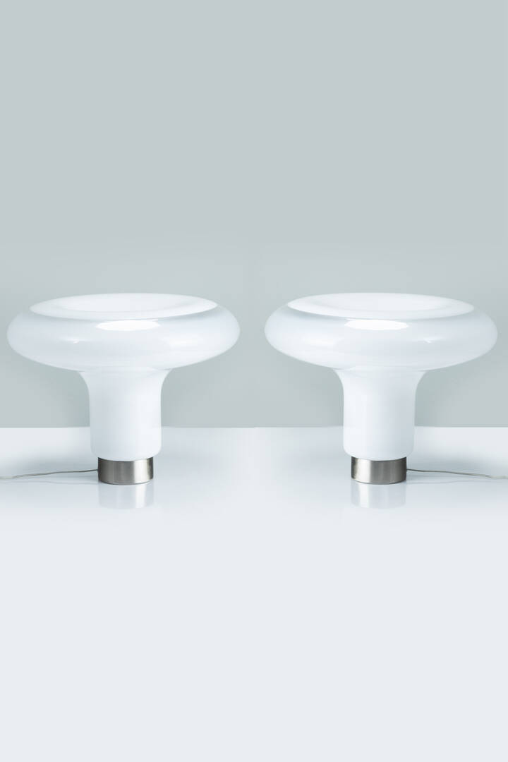 Coppia di lampade da tavolo in alluminio e vetro soffiato.