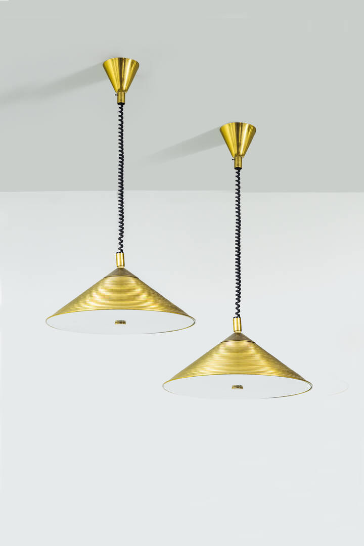 Coppia lampade a sospensione con struttura in ottone, diffusore in vetro satinato.