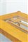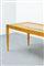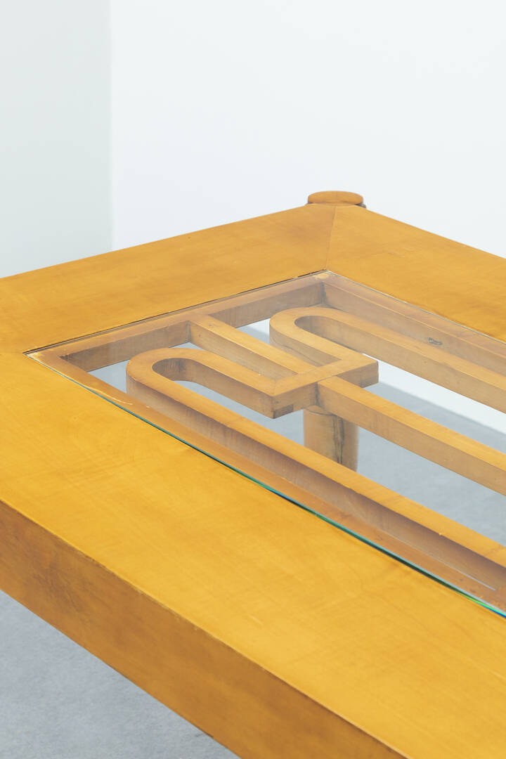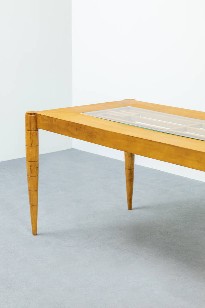 Tavolo in legno d'acero, piano con al centro vetro a coprire il motivo ornamentale.