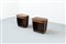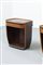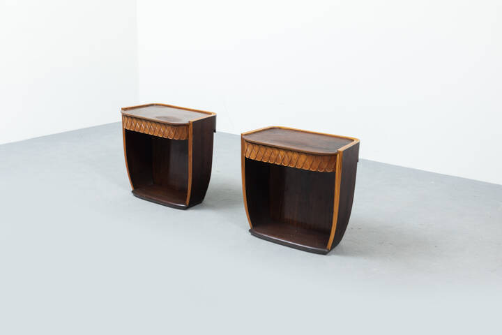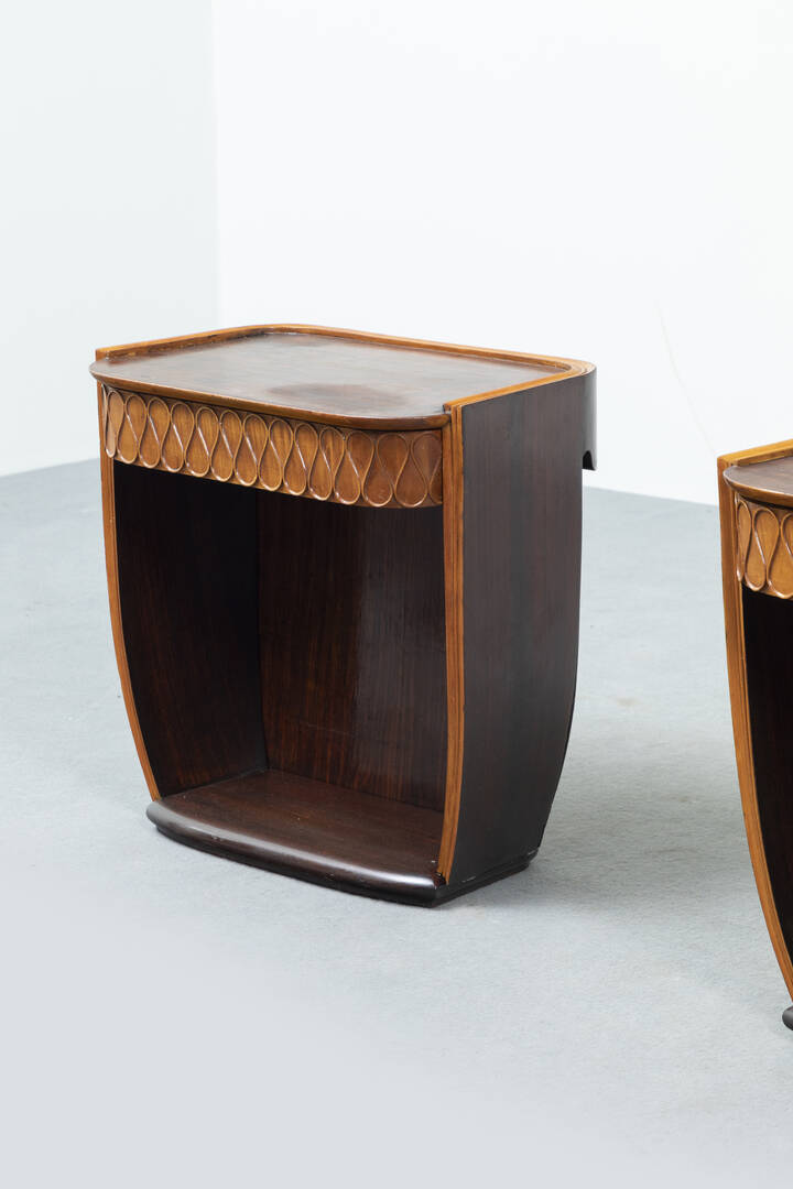 Coppia di comodini con struttura in legno ed elementi decorativi sul fronte dei cassetti