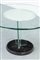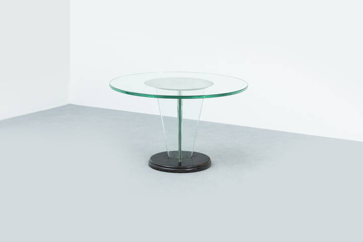 Tavolino con sostegno centrale in vetro, piano in vetro e vetro specchiato, base in legno.
