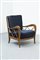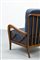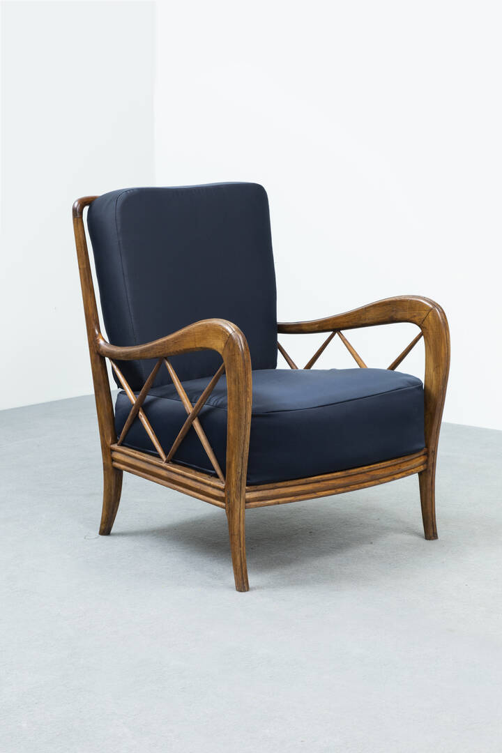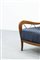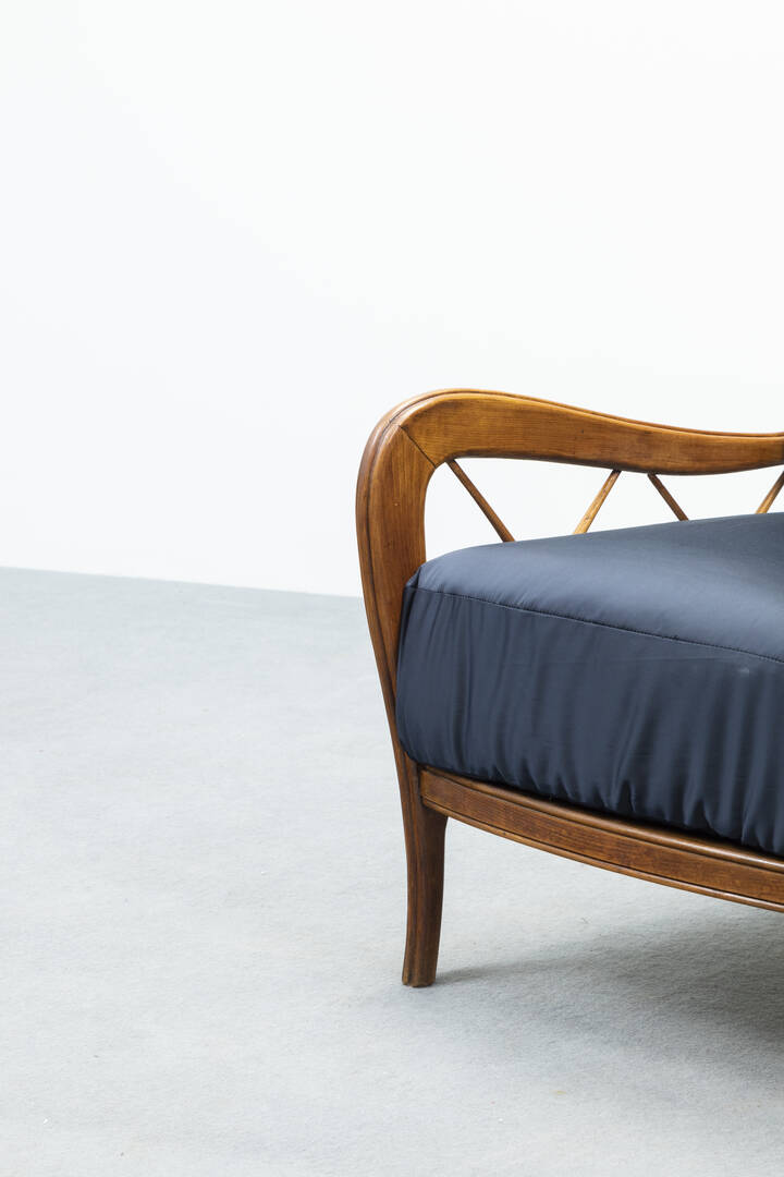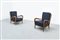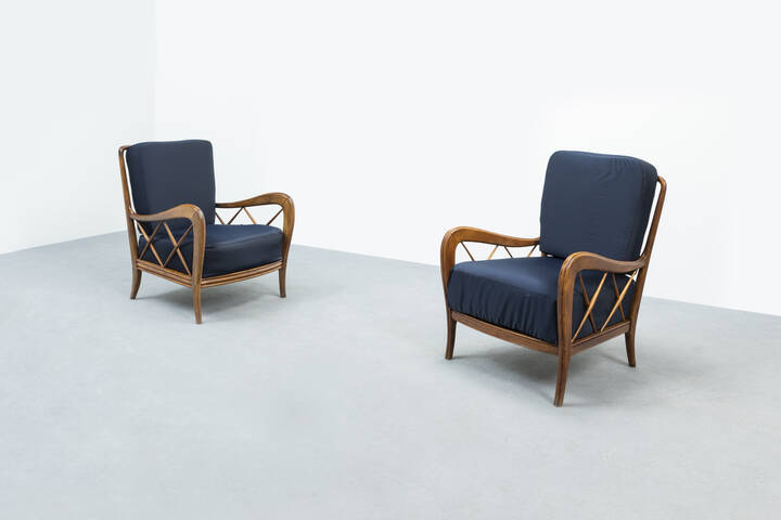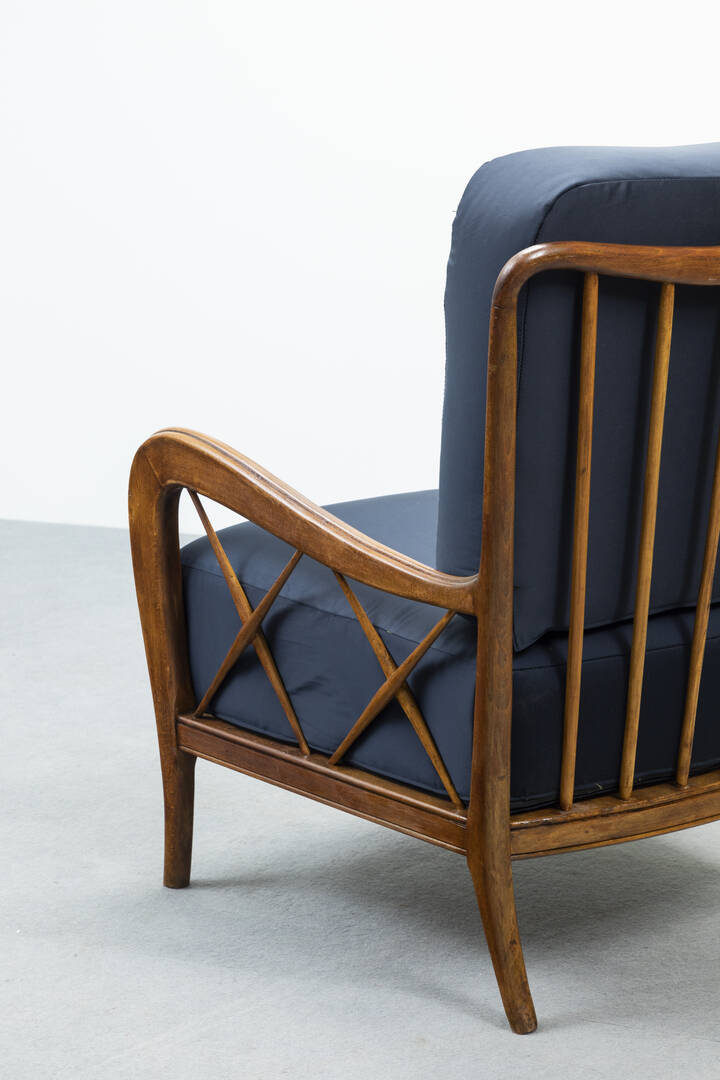 Coppia di poltrone con struttura in legno, cuscini imbottiti rivestiti in tessuto.