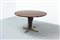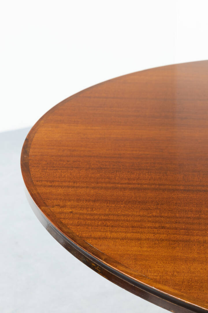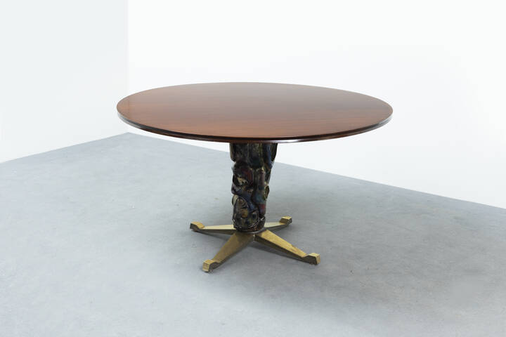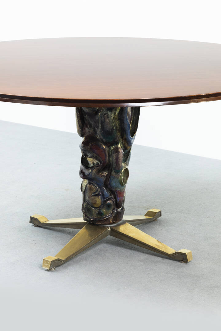 Tavolo con sostegno centrale in ceramica smaltata di Pietro melandri, piano in legno, piede in ottone.