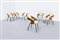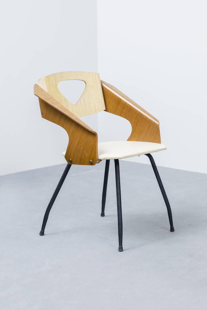 Sei sedie in compensato, gambe in tondino di metallo verniciato.