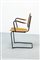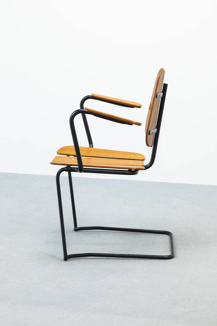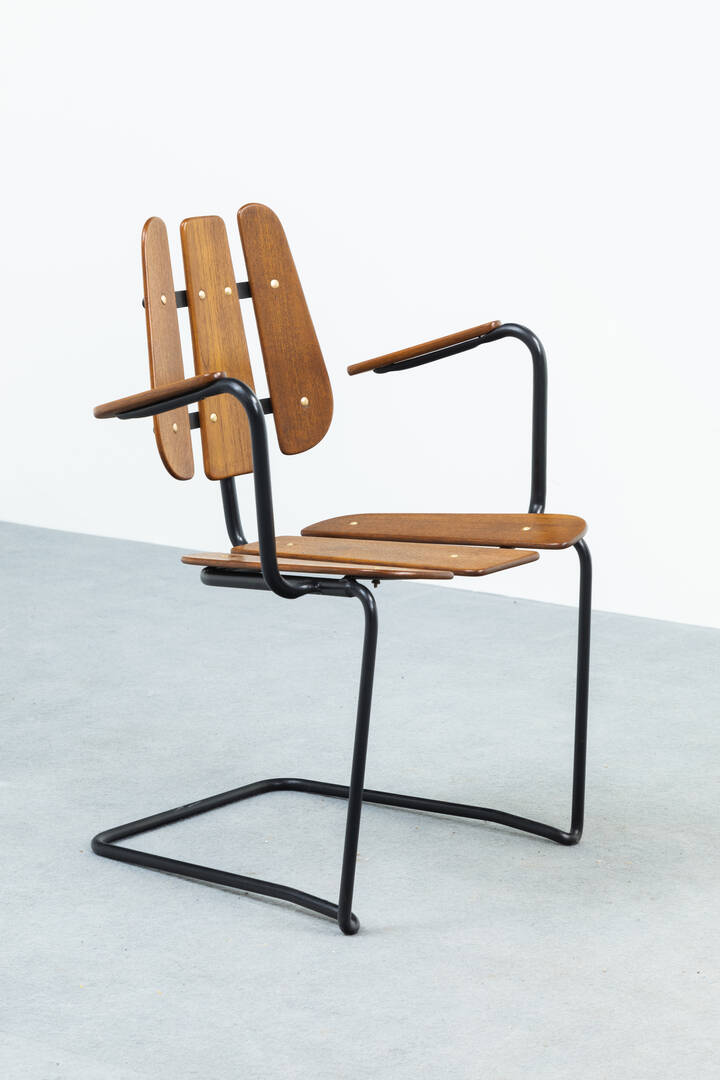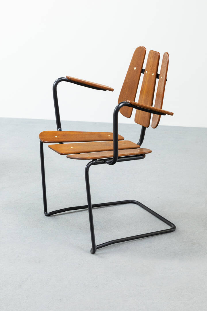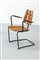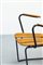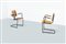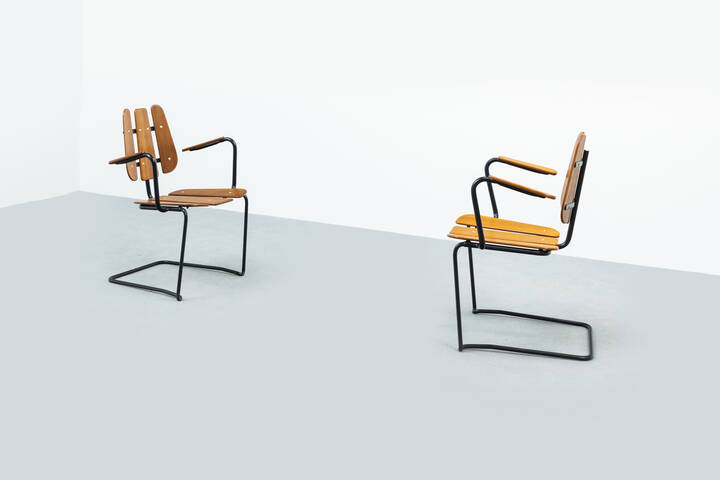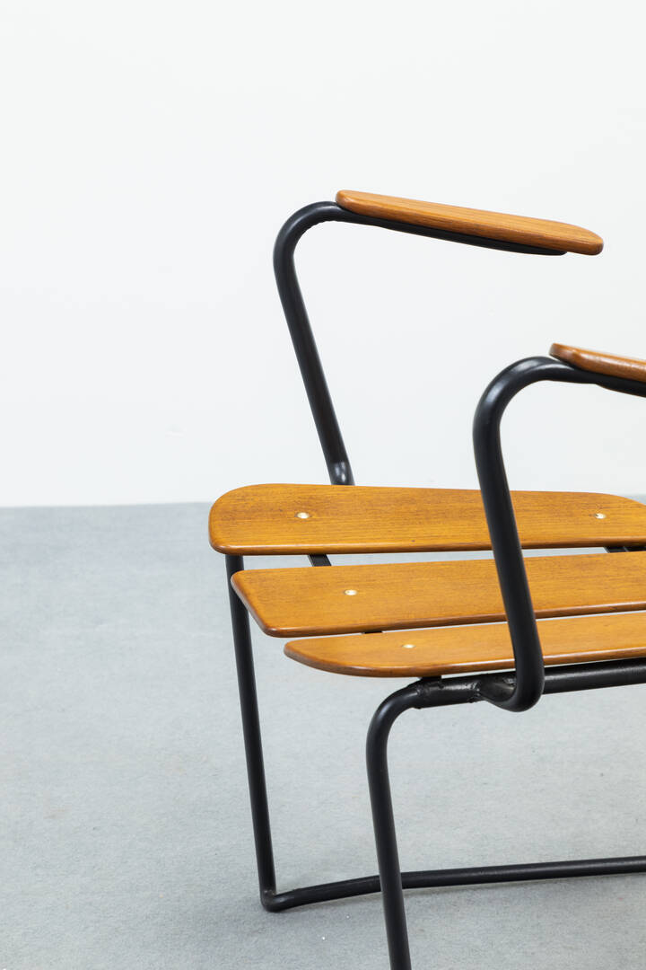 Coppia di poltrone in legno, gambe in tondino di metallo verniciato.